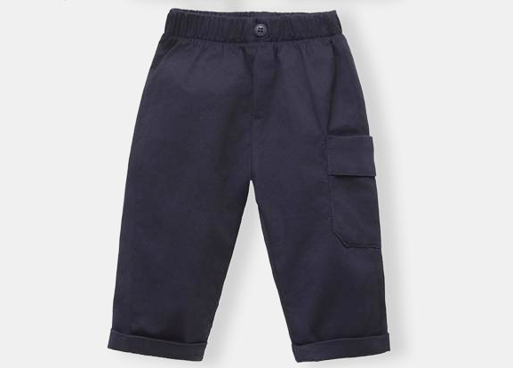 Pantaloni da bambino con elastico in vita, tascone su una gamba e risvoltini.
