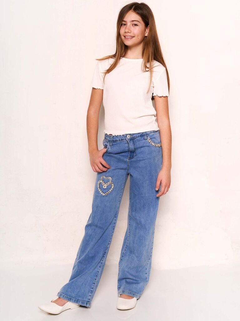 Jeans bimba con cuore strass e tasca con strass.