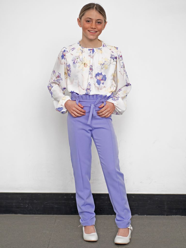 Pantalone dal taglio classico con vita alta in plissè. Laccio in tessuto tono su tono con doppi passanti. Dettaglio di cucitura in rilievo su gamba