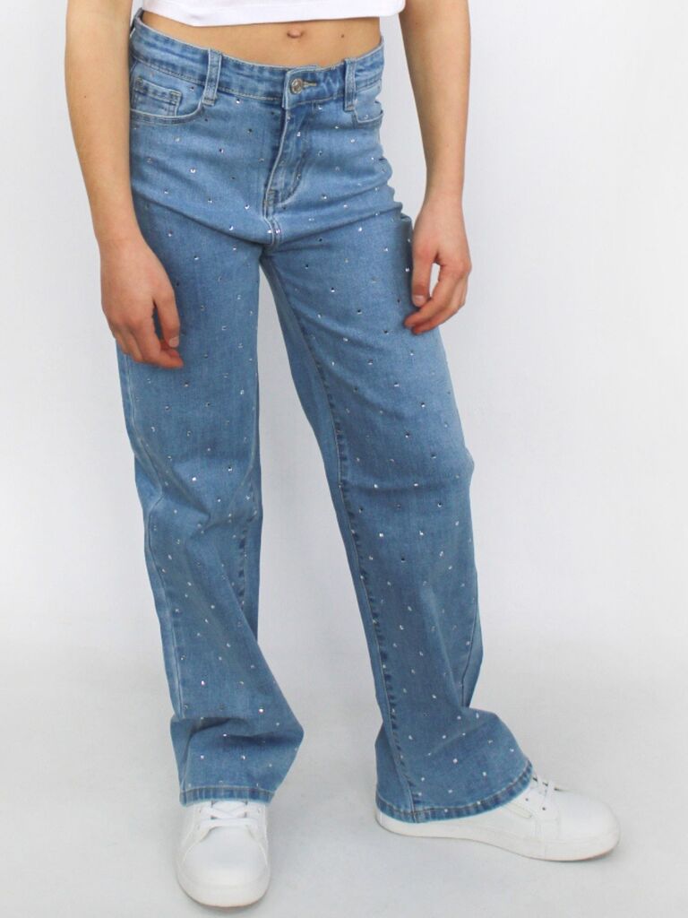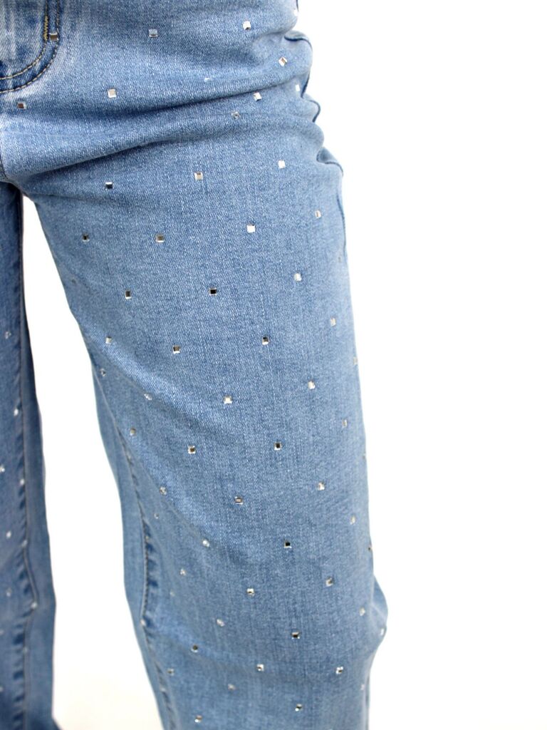 DESCRIZIONE: Jeans gamba larga con brillantini e tasche oblique, chiusura con zip e bottone Composizione: 79% cotone, 19% poliestere, 2% elastan Codice prodotto: 258165