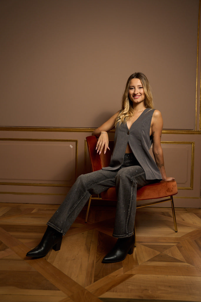 DESCRIZIONE: Pantalone in denim dal taglio svasato, arricchito da piccoli strass applicati che donano luminosità e un tocco glam. A vita regolare, con linea a zampa che slancia la figura, è perfetto per creare look casual chic con un dettaglio brillante. CODICE PRODOTTO: 260187