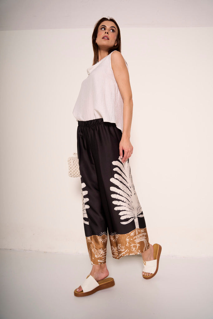 Con il suo ampio volume e la stampa foglia bianca su fondo nero, questo pantalone si distingue per stile e personalità. Realizzato in tessuto fluido, garantisce libertà di movimento e comfort. I dettagli dorati sul fondo aggiungono un accento raffinato, rendendolo perfetto per outfit estivi dall’allure boho o elegante.