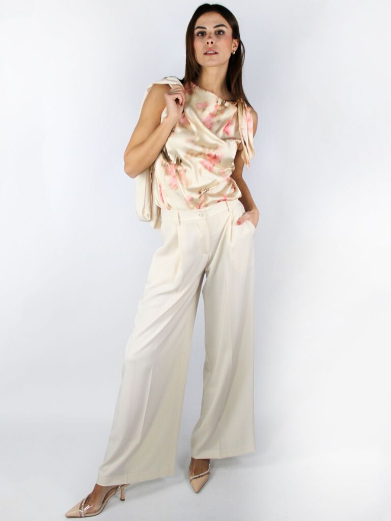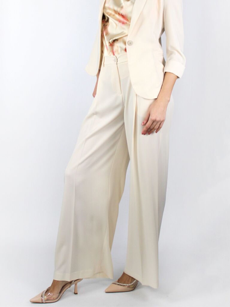 pantalone con tessuto fluido, un bottone, tasche oblique e pinces davanti