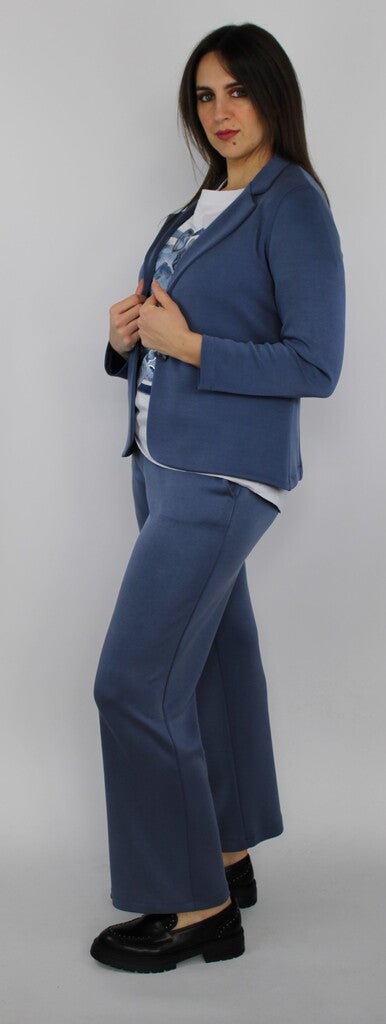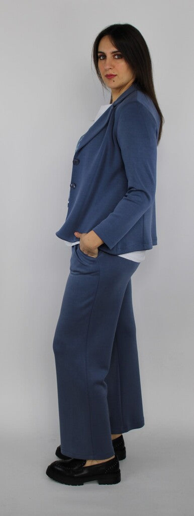 Pantalone elegante e confortevole in un raffinato blu polvere, realizzato in tessuto fluido che accompagna i movimenti con leggerezza. Il taglio dritto e la vita regolare garantiscono comfort e versatilità, perfetto per un completo raffinato o da abbinare a capi casual per uno stile rilassato ma curato.