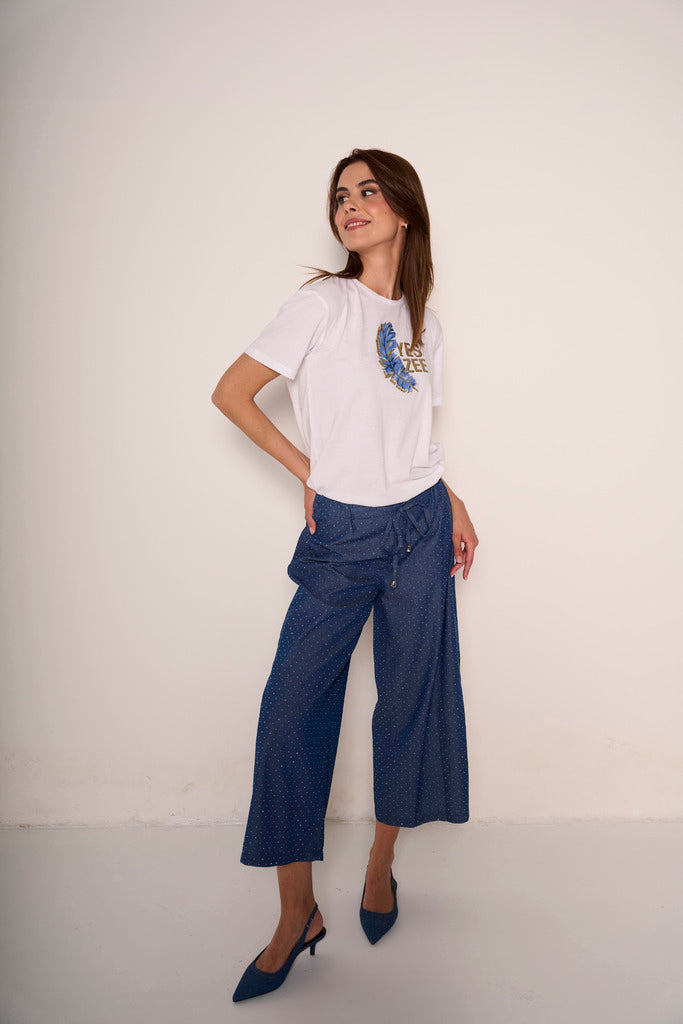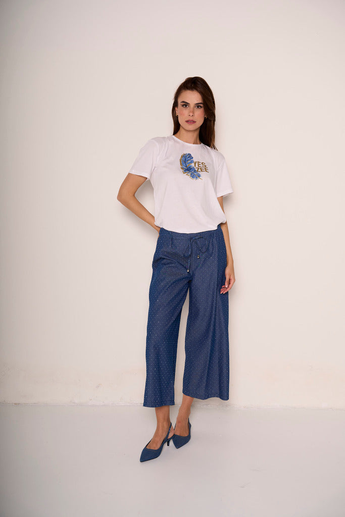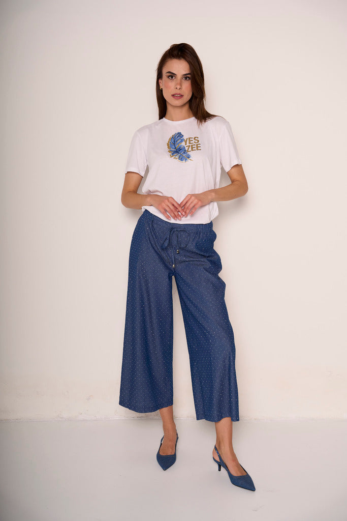 Questi pantaloni cropped blu denim uniscono comfort e brillantezza. Il taglio morbido e leggermente svasato regala una silhouette disinvolta, mentre i piccoli strass applicati lungo la gamba aggiungono un tocco glam che li rende perfetti anche per la sera. Elastico in vita e tessuto fluido per una vestibilità comoda ma ricercata. Abbinali a una t-shirt minimal o a un top elegante per un look che non passa inosservato.
