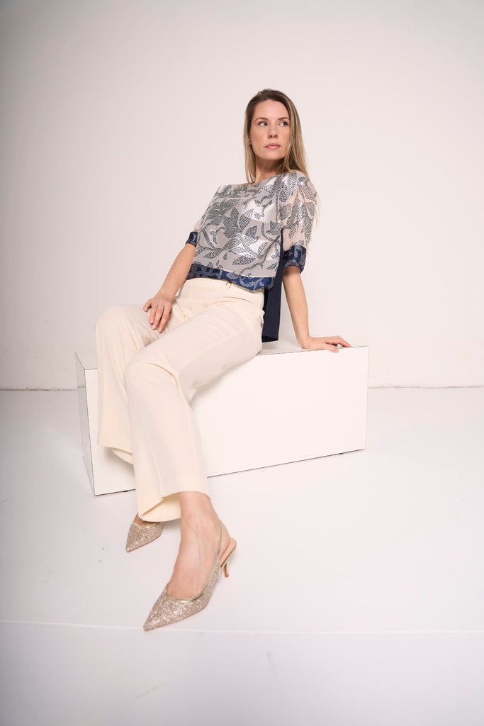 Pantalone palazzo dalla linea fluida e sofisticata, realizzato in morbido cotone color burro. Il design a vita alta slancia la figura, mentre la fibbia con gancio dorato aggiunge un dettaglio chic e discreto. Perfetto per un look da giorno raffinato o per eventi formali, si abbina facilmente a bluse stampate o top minimal. Taglio sartoriale con piega centrale e zip laterale.Codice prodotto: 257519