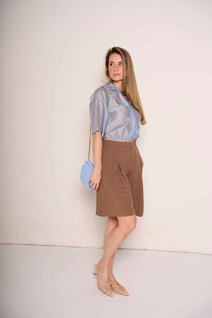Raffinato nella semplicità, questo bermuda in misto lino color cuoio è il compagno ideale per l’estate. Il tessuto naturale e traspirante garantisce freschezza e comfort, mentre la vita alta e le tasche laterali aggiungono funzionalità e carattere. Perfetto con t-shirt, top o camicie leggere, si adatta a ogni occasione con uno stile casual ma curato. Un pezzo chiave per chi ama vestire con naturale eleganza.