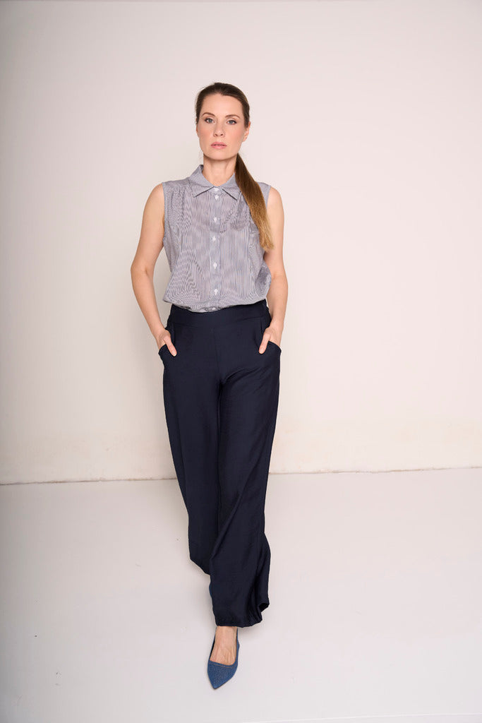 Libertà di movimento e stile contemporaneo si fondono in questi pantaloni flowy a vita alta. La gamba morbida e il taglio ampio disegnano una linea elegante e rilassata, mentre le tasche laterali aggiungono praticità. Realizzati in tessuto leggero e traspirante, sono l’ideale per affrontare la giornata con un tocco sofisticato, sia in città che in vacanza.