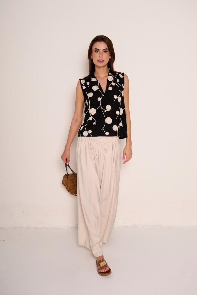 Realizzato in misto lino, questo pantalone beige con gamba a palazzo offre una vestibilità rilassata e uno stile naturale. La vita elasticizzata con coulisse assicura comfort durante tutto il giorno, mentre la linea essenziale con pence lo rende facile da abbinare a top, camicie o canotte. Un capo versatile e pratico per ogni occasione.