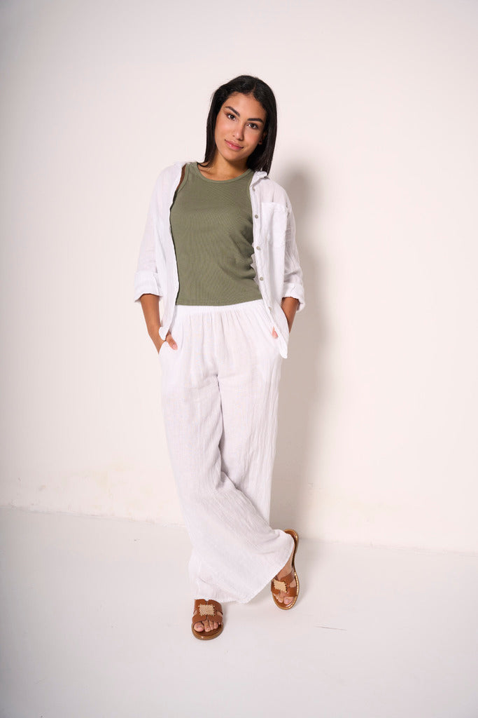 Questi pantaloni in lino uniscono eleganza e praticità in un solo capo. La vestibilità ampia e il tessuto fresco garantiscono massima libertà di movimento, perfetti per ogni occasione, dal tempo libero agli eventi più raffinati. Disponibili nei colori bianco e cioccolato, sono un must-have per chi ama un look naturale e sempre impeccabile.