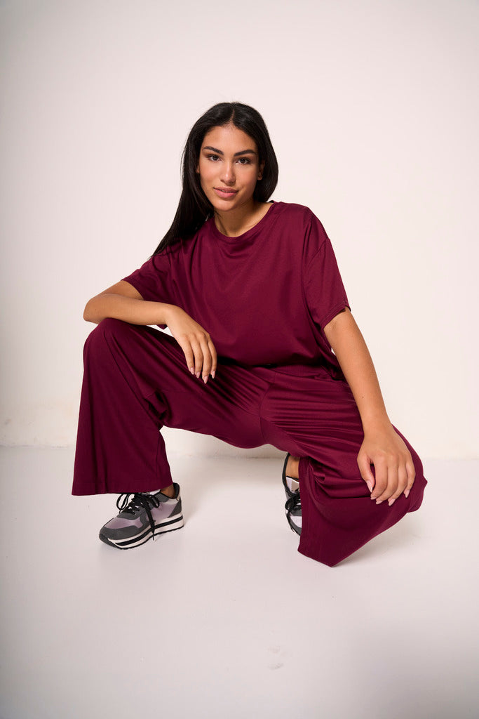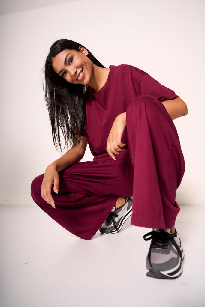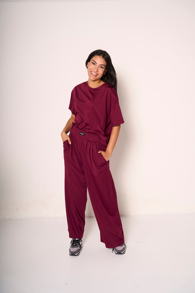 Questi pantaloni ampi con elastico in vita sono il capo must-have per chi cerca uno stile casual-chic senza rinunciare alla comodità. La vestibilità fluida e la nuance bordeaux li rendono perfetti per l’estate in città, ma anche per viaggi e weekend rilassati. Indossali con la t-shirt in coordinato per un total look di tendenza o spezzali con capi neutri per un contrasto raffinato.