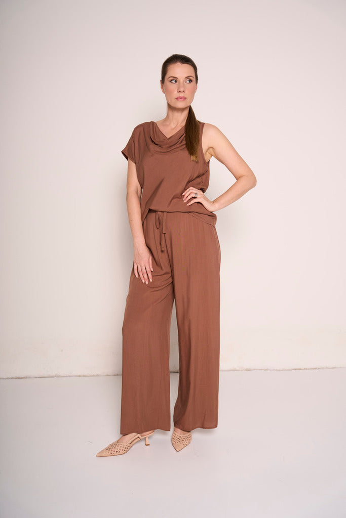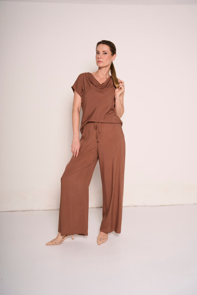 Questi pantaloni cioccolato a gamba larga sono l’emblema del comfort estivo. Realizzati in tessuto fresco e leggero, offrono una silhouette fluida e moderna, mentre la vita elasticizzata con coulisse garantisce una vestibilità pratica e regolabile. Ideali per la città, il viaggio o il relax, si abbinano perfettamente a t-shirt, top o camicie dal taglio morbido. Un capo versatile per vivere ogni giornata con stile.