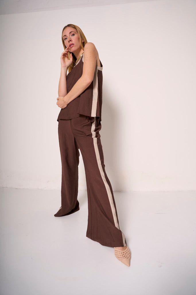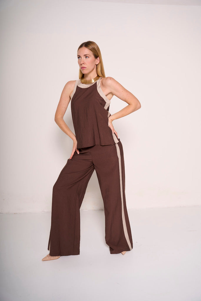 Con il suo taglio ampio e fluido, questo pantalone marrone conquista per praticità e charme contemporaneo. Il dettaglio beige lungo i fianchi regala un twist grafico che snellisce la figura e aggiunge personalità al look. Comodo ma ricercato, si abbina perfettamente alla canotta coordinata o si reinventa con top neutri o colorati per look versatili e sempre on point.