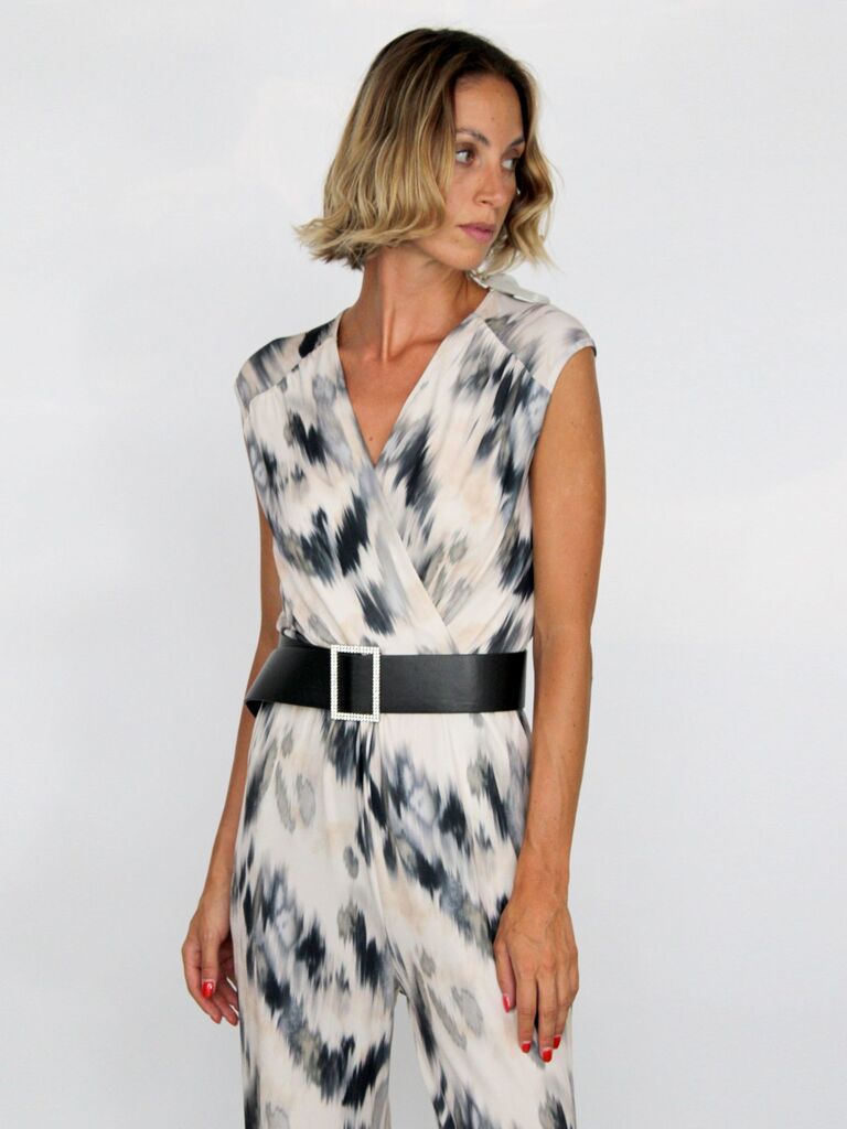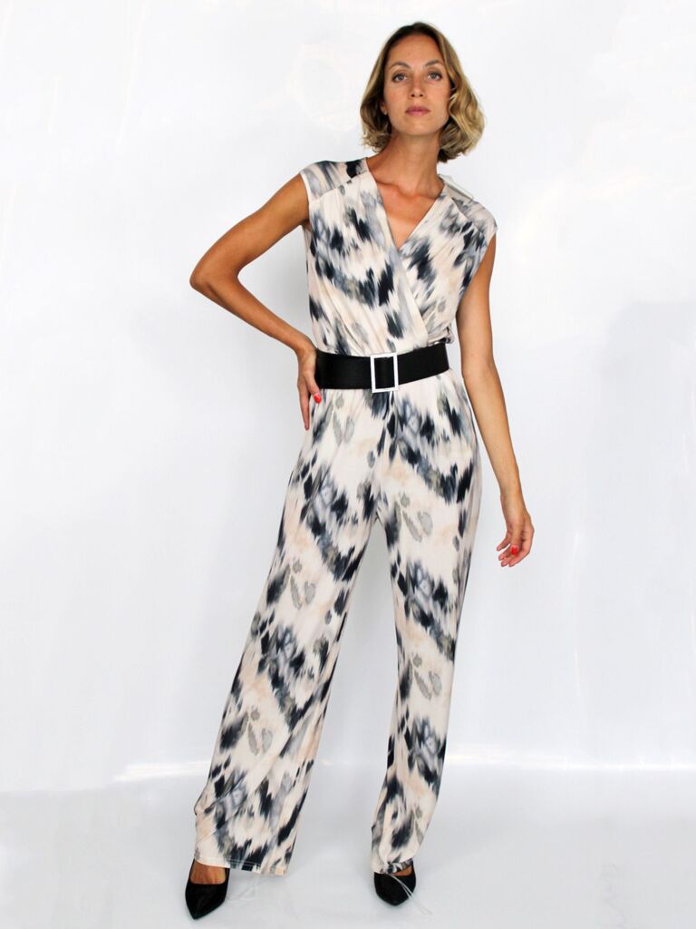 Tuta smanicata in fantasia, scollo incrocio, gamba morbida. Senza cintura