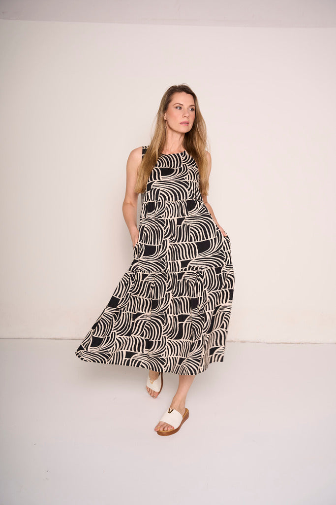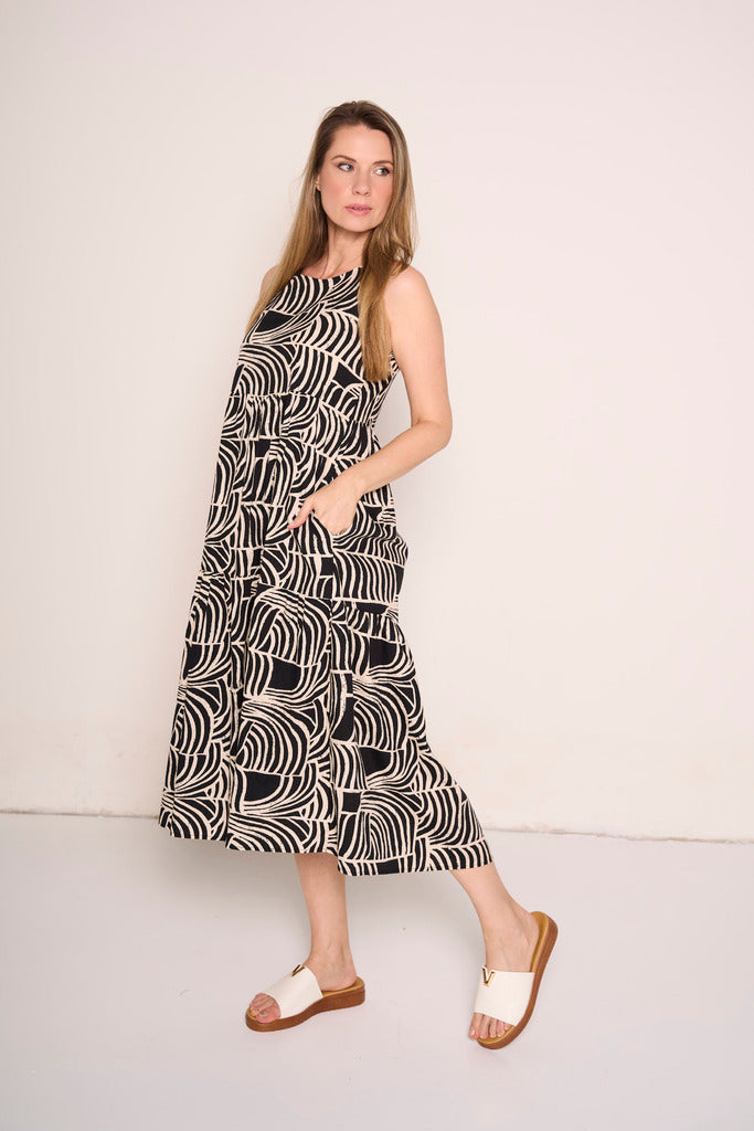 DESCRIZIONE: Eleganza e comfort si incontrano in questo abito dalla fantasia geometrica dal design moderno. Il taglio fluido valorizza la silhouette senza costrizioni, mentre le linee grafiche creano un effetto visivo sofisticato e originale. Codice prodotto: 258901