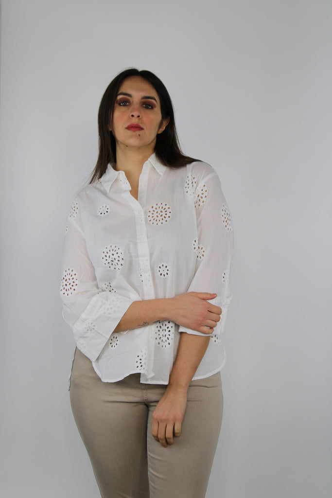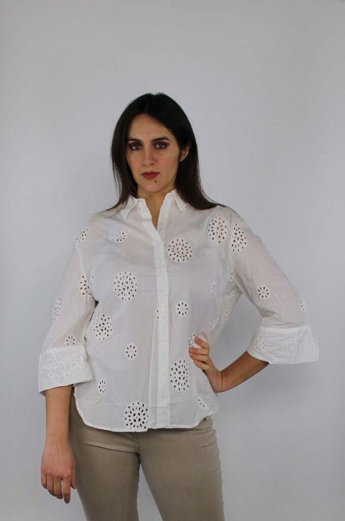 Camicia leggera in puro cotone bianco con lavorazione traforata a motivi circolari. Manica a 3/4, taglio dritto e collo classico per uno stile fresco e femminile, perfetta per la primavera e l’estate. Ideale con jeans o pantaloni beige per un look casual chic.Composizione: 100% cotone