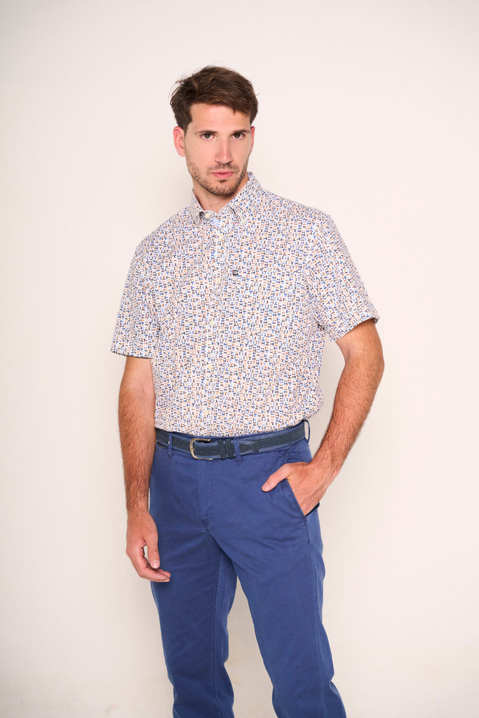 Linee essenziali e carattere deciso per il camiciotto da uomo a mezza manica, perfetto per affrontare l’estate con stile. Realizzata in tre fantasie differenti – tra cui quella in foto – è pensata per chi cerca un look fresco e distintivo. Il taschino sul petto aggiunge un tocco pratico, mentre i dettagli a contrasto, come l’interno della fila dei bottoni, conferiscono un’eleganza casual e curata. Da abbinare facilmente a jeans, bermuda o pantaloni chino per uno stile che non passa inosservato.