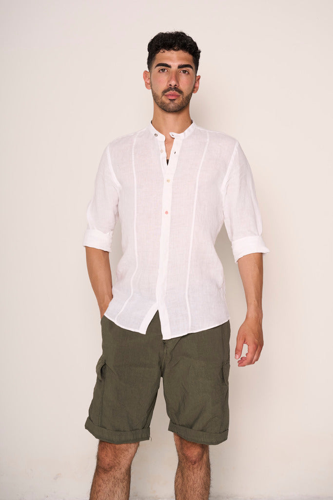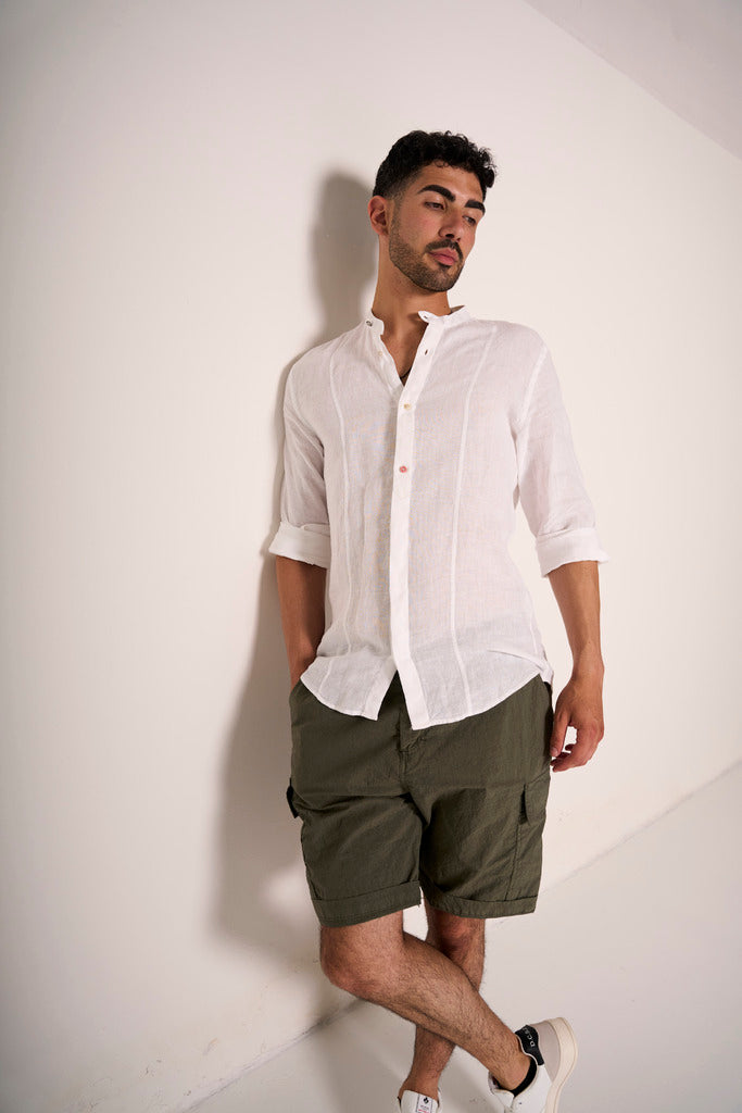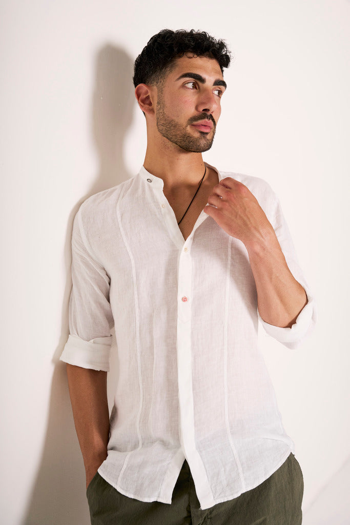 Un capo che racconta personalità. Questa camicia a maniche lunghe in misto lino si distingue per il suo collo alla coreana dal fascino sobrio, le cuciture a vista che esaltano la struttura sartoriale e la mezza abbottonatura frontale impreziosita da bottoni tutti diversi, un dettaglio creativo che rende ogni pezzo unico. Ideale per chi ama uno stile rilassato ma ricercato, si abbina perfettamente a pantaloni estivi o bermuda per un look naturale e contemporaneo.