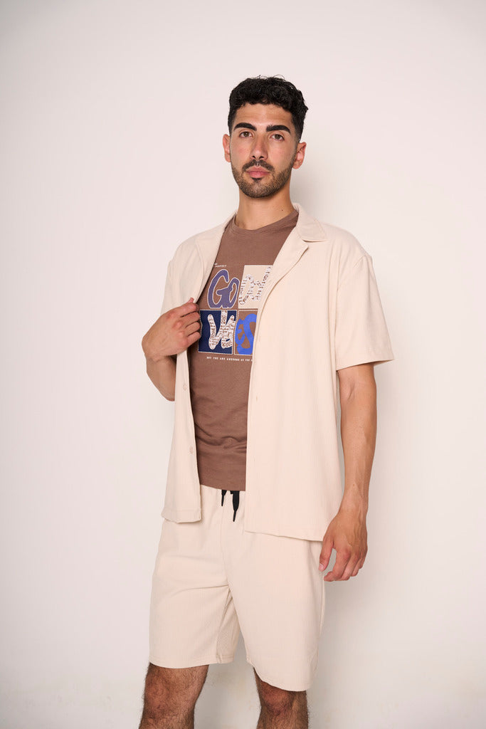 Leggerezza estiva con un tocco vintage. Questo camiciotto beige è perfetto per affrontare la stagione calda con stile e freschezza. Il collo bowling, dal fascino rétro, si unisce a una chiusura con bottoni frontali e a una trama a sottili striature verticali, che dona profondità e carattere al capo.Dallo stile rilassato ma curato, è ideale da abbinare a bermuda o pantaloni in lino per un look disinvolto ma distintivo. Il capo perfetto per chi cerca eleganza informale e attenzione ai dettagli.