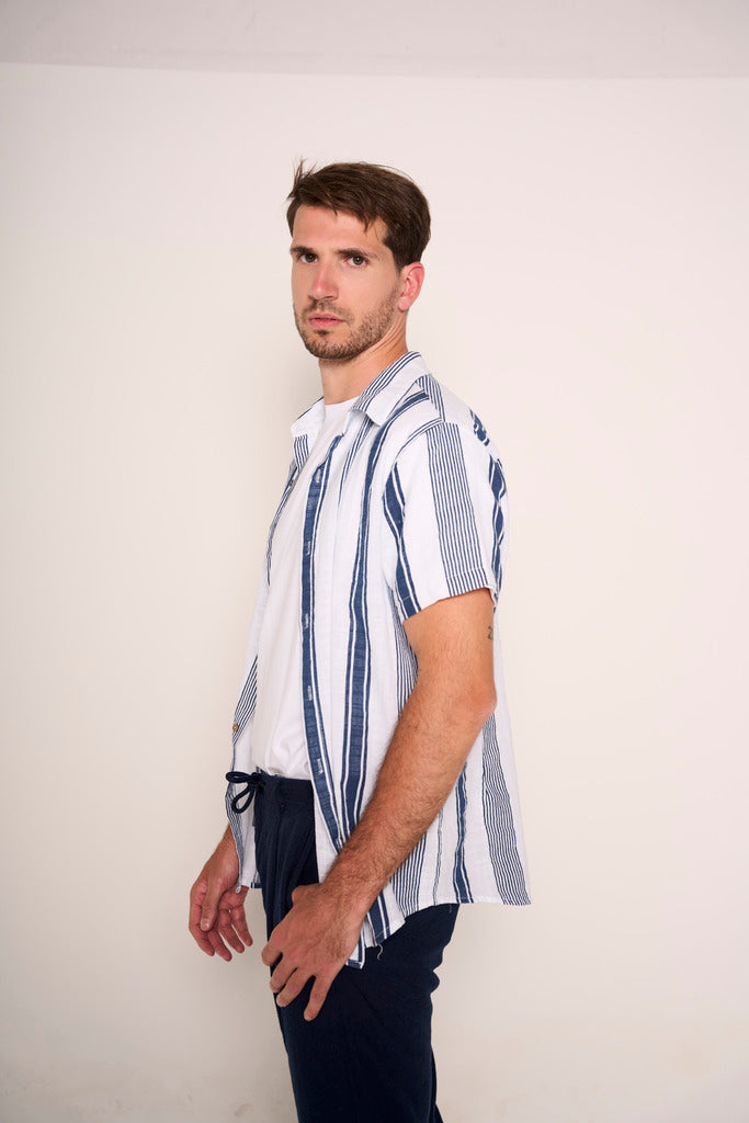 Fresca, versatile e dallo stile disinvolto: questa camicia in puro cotone a righe è il capo ideale per l’estate. Il design relaxed con manica corta e il collo classico la rendono perfetta da indossare aperta su una t-shirt o abbottonata per un look più ordinato. Le righe verticali in diverse tonalità di blu aggiungono dinamismo e slanciano la figura. Ottima sia per le vacanze che per il tempo libero in città.