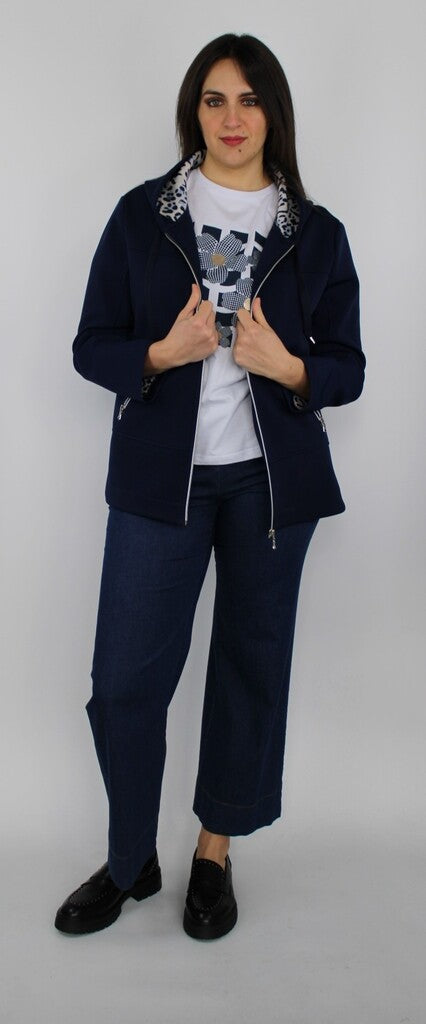 Felpa in tessuto tecnico blu navy con chiusura a zip doppio cursore, tasche con zip e cappuccio regolabile. Interno del cappuccio con stampa animalier a contrasto per un tocco grintoso. Linea morbida e pratica, perfetta per look casual e sportivi con stile.