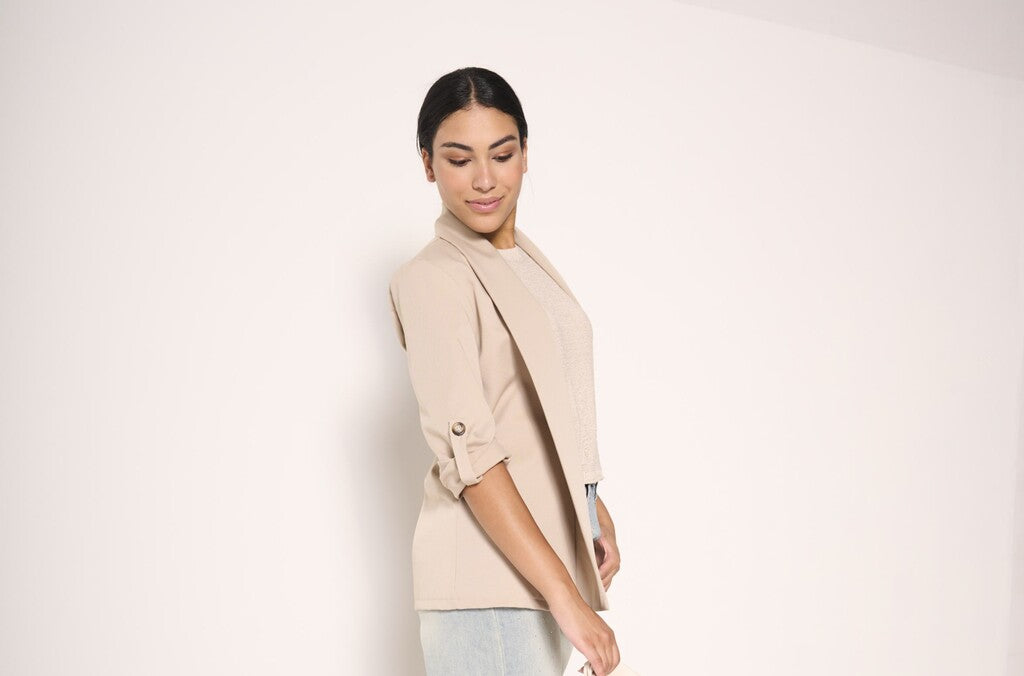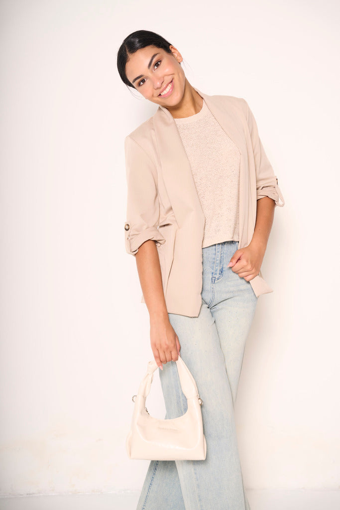 Eleganza rilassata e versatilità quotidiana si incontrano in questa giacca beige leggera, perfetta per completare ogni look. Il design aperto senza chiusura la rende ideale da sovrapporre a t-shirt o top, mentre le maniche arrotolate con bottone donano un tocco dinamico e di tendenza. Realizzata in un tessuto fresco e confortevole, è perfetta per la mezza stagione o le serate più fresche d’estate. Abbinala a jeans o pantaloni palazzo per uno stile casual chic impeccabile. Un capo da avere sempre a portata di mano.