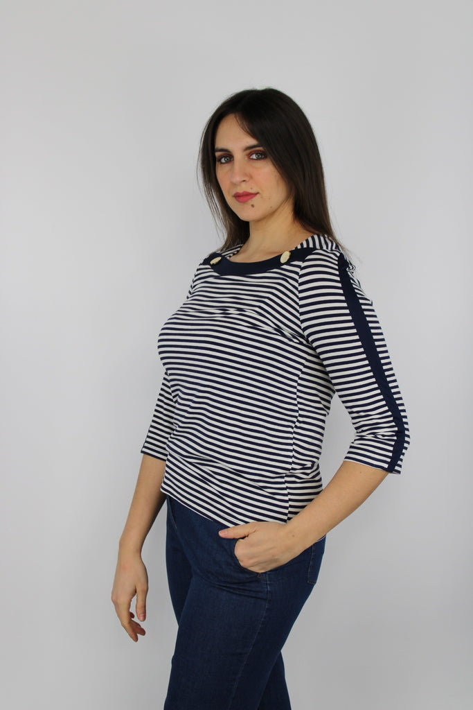 Maglia a maniche 3/4 in stile marinaro, caratterizzata da righe blu navy e bianche e impreziosita da eleganti bottoni dorati sulle spalle. Lo scollo ampio a barchetta e la vestibilità morbida rendono questo capo ideale per un look casual chic. Perfetta da abbinare a jeans o pantaloni bianchi per un outfit fresco e raffinato.