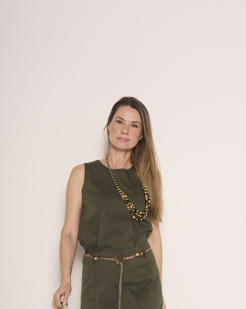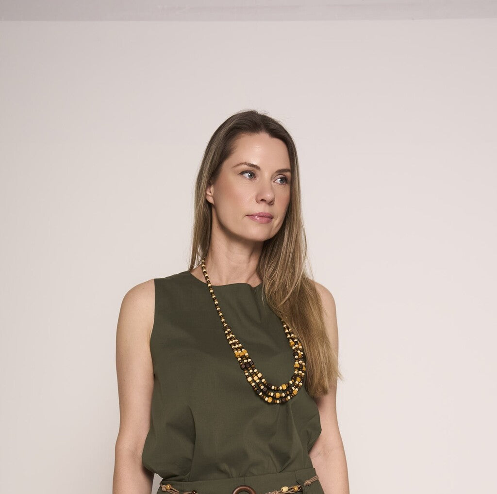 Essenziale ma di carattere, questa canottiera verde militare o cioccolato è realizzata in tessuto fresco e leggero, perfetto per l’estate. Il taglio semplice con spalline sottili valorizza la figura e la rende facilmente abbinabile a gonne, pantaloni o shorts a vita alta. Ideale da indossare infilata per un look curato e minimal.