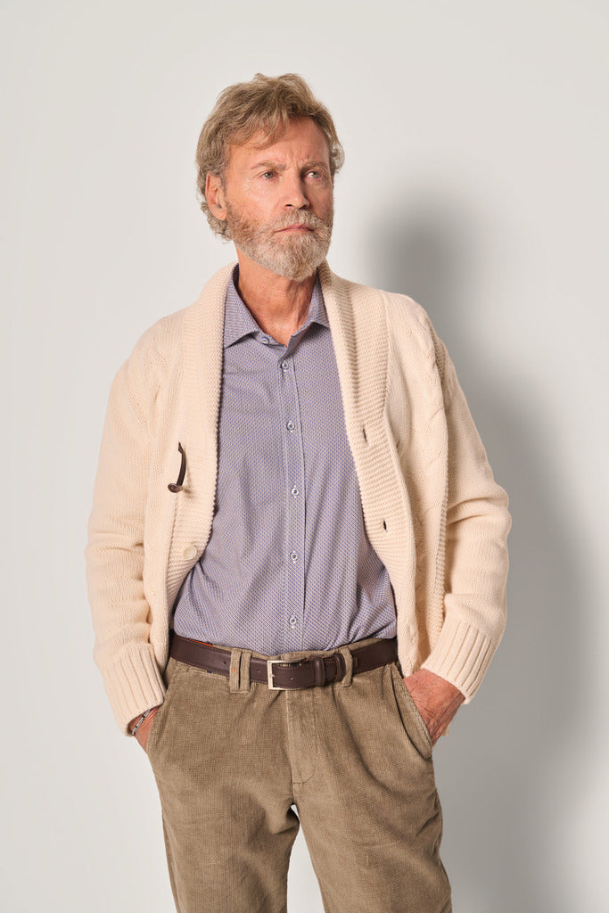 La maglia con collo sciallato è un capo intramontabile, pensato per l’uomo che ama il comfort senza rinunciare all’eleganza. Realizzata con lavorazione a trecce, offre calore e morbidezza ideali per la stagione fredda.Il design con collo sciallato e chiusura frontale con bottoni e alamaro in legno aggiunge un tocco vintage e raffinato, perfetto per outfit casual o per look più curati. La lavorazione a maglia grossa e i bordi a costine valorizzano la struttura del capo, rendendolo solido e accogliente.