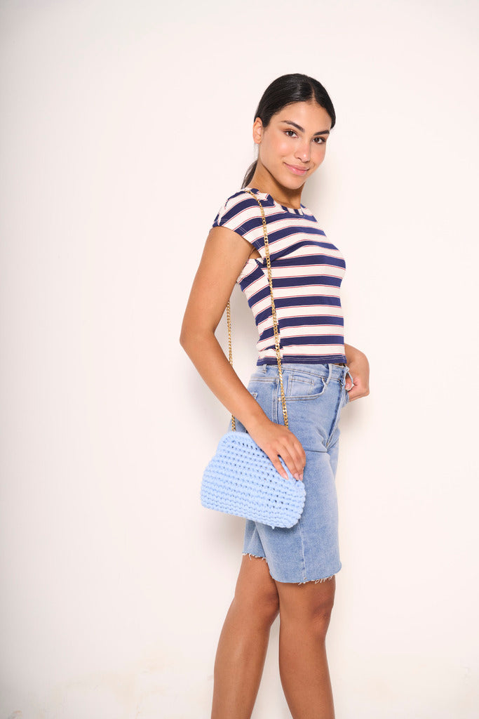 Porta una ventata di stile marinaro nel tuo guardaroba con questa t-shirt a righe blu e bianche. Il taglio classico e il tessuto in cotone morbido la rendono una scelta perfetta per le giornate più calde. Versatile e intramontabile, è l’alleata ideale per look casual e rilassati, da abbinare facilmente a jeans o bermuda. Un must-have per chi ama la semplicità con carattere.