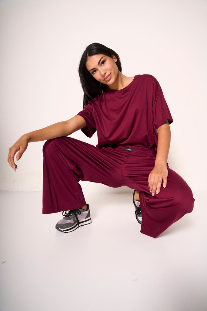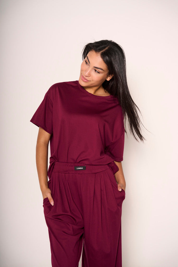 Minimal nel design, massima nell’effetto: questa t-shirt bordeaux è la base perfetta per look rilassati ma curati. Il taglio leggermente morbido e il tessuto piacevole al tatto la rendono comoda per tutto il giorno, mentre il colore intenso aggiunge un tocco deciso anche al più semplice degli outfit. Da abbinare con denim, gonne o – per un effetto coordinato – con i pantaloni in tinta.