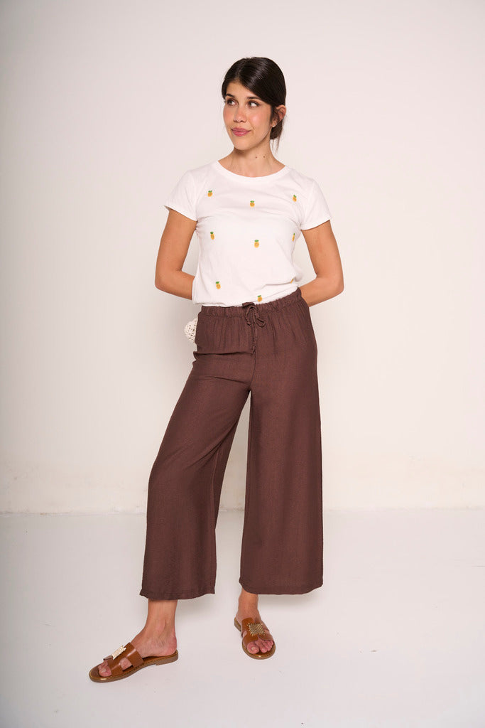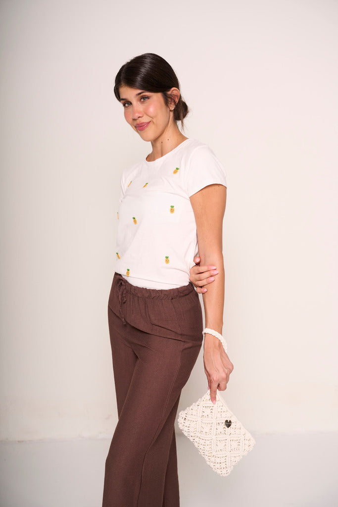 Dì ciao al buonumore con questa t-shirt bianca decorata da simpatici ananas ricamati! Il taglio morbido e il tessuto leggero la rendono perfetta per le giornate più calde, mentre il motivo fruttato aggiunge un twist giocoso e originale al tuo look. Ideale con shorts, jeans o gonne, per outfit spensierati ma curati. Una maglietta che non passa inosservata e che profuma subito di estate!