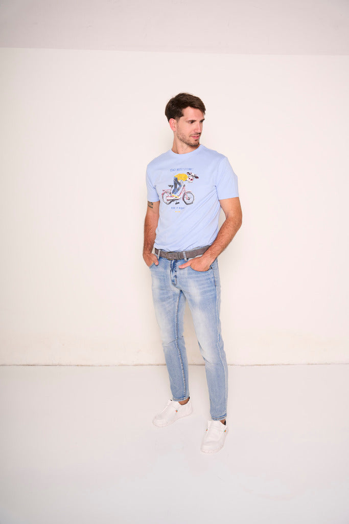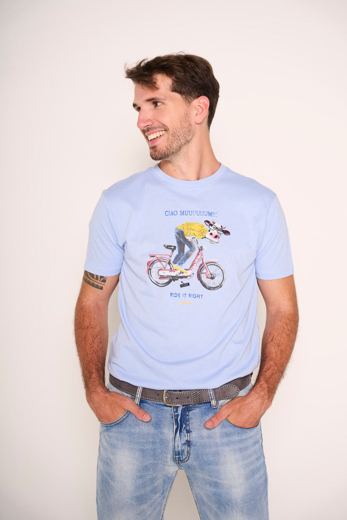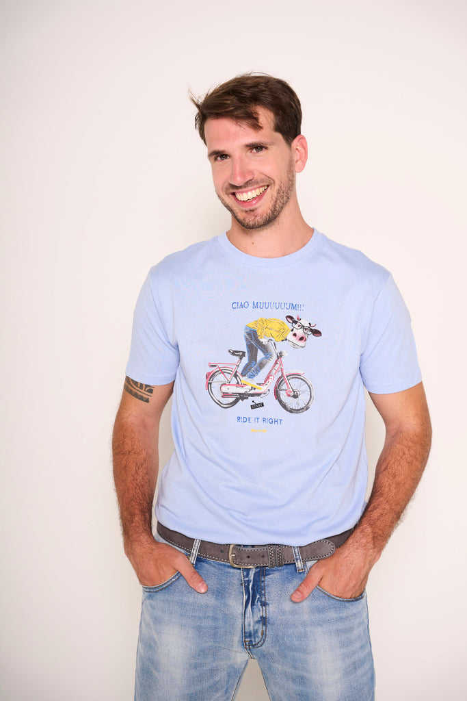 Una maglietta che parla di libertà, allegria e voglia di distinguersi! La t-shirt azzurra “Ciao Muuuuuum!!” è un’esplosione di creatività: protagonista una simpatica mucca in jeans e giacca gialla che pedala spensierata verso nuove avventure. Le scritte “CIAO MUUUUUUM!!” in alto e “RIDE IT RIGHT” in basso aggiungono un twist ironico e motivazionale. Perfetta per chi ama pedalare nella vita col sorriso, con stile e senza prendersi troppo sul serio. Realizzata in morbido cotone premium per garantirti comfort assoluto in ogni momento. Aggiungila al carrello e preparati a far girare teste!