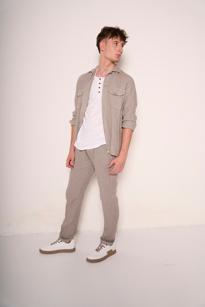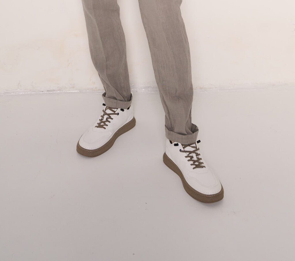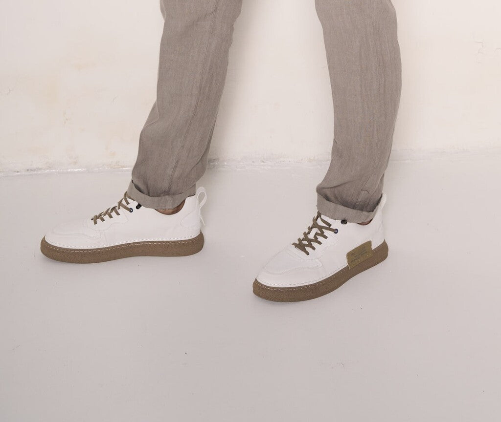Sneakers in pelle effetto liscio bianca con suola in gomma color caramello e lacci marroni a contrasto. Design sportivo con un tocco retrò, perfette per un look urbano ma pulito. Ideali da abbinare a pantaloni in lino o denim chiaro per un outfit moderno e funzionale.Codice prodotto: 256229