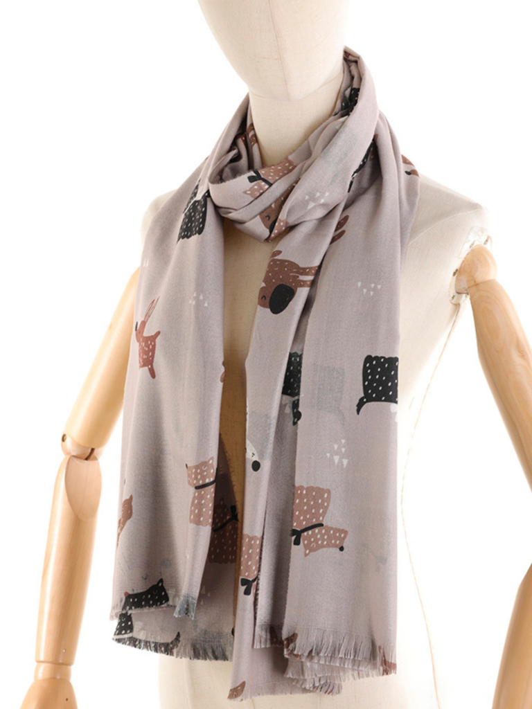 Questa sciarpa presenta una base in tinta unita decorata con simpatici cani stilizzati in stampa all over. Morbida e leggera, con piccole frange sul bordo, è l’accessorio ideale per aggiungere un tocco giocoso e personale ai tuoi outfit quotidiani. Disponibile in diverse varianti colore.