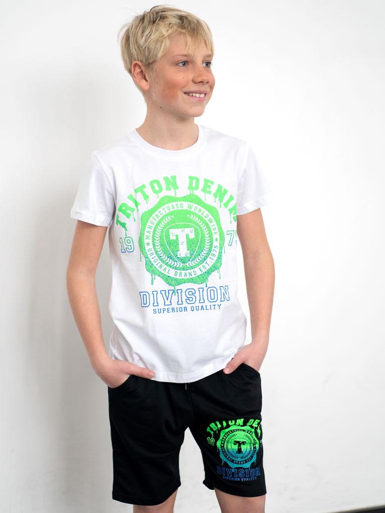 Completo due pezzi. Maglietta con collo rotondo e maniche corte. Stampa sul petto. Bermuda con vita elasticizzata e lacci regolabili sulla parte anteriore. Tasche anteriori