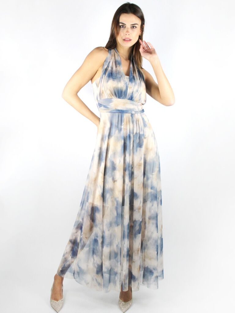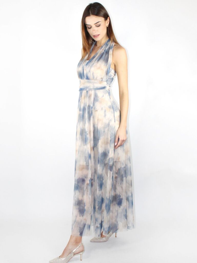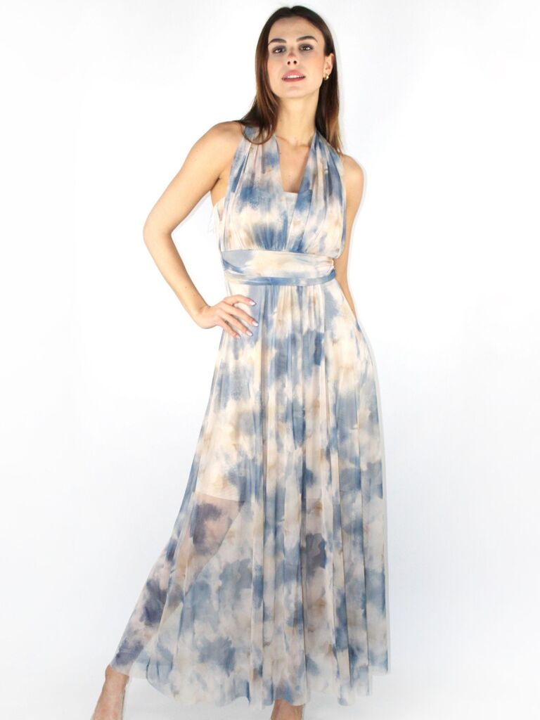 DESCRIZIONE: Abito lungo in fantasia acquerello, con sottoveste, scollo con nodo dietro e fascia in vita Composizione: 95% poliestere, 5% elastan Codice prodotto: 258061