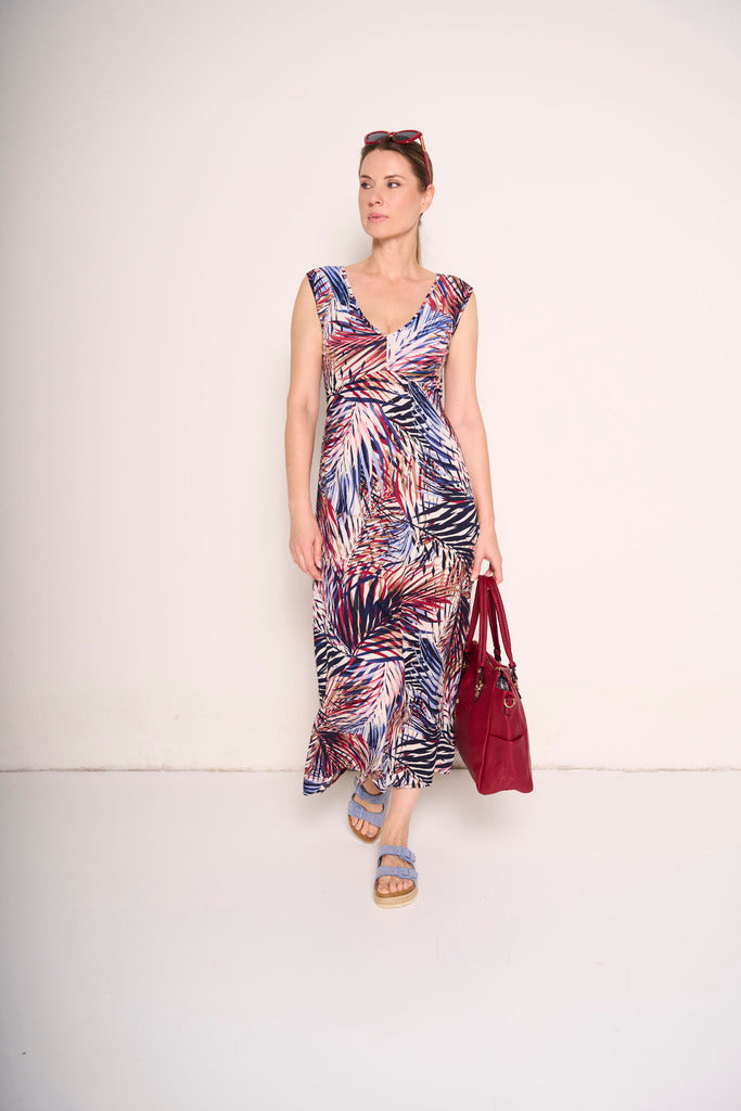 Vivi l’estate con stile grazie a questo abito lungo dal fascino esotico. La stampa tropicale multicolore evoca paesaggi da sogno, mentre lo scollo a V e le spalline larghe donano un tocco di femminilità e comfort. La silhouette fluida accompagna i movimenti con eleganza, rendendolo perfetto per una passeggiata al tramonto o una serata in riva al mare. Abbinalo a sandali essenziali e accessori vivaci per un look fresco e raffinato.