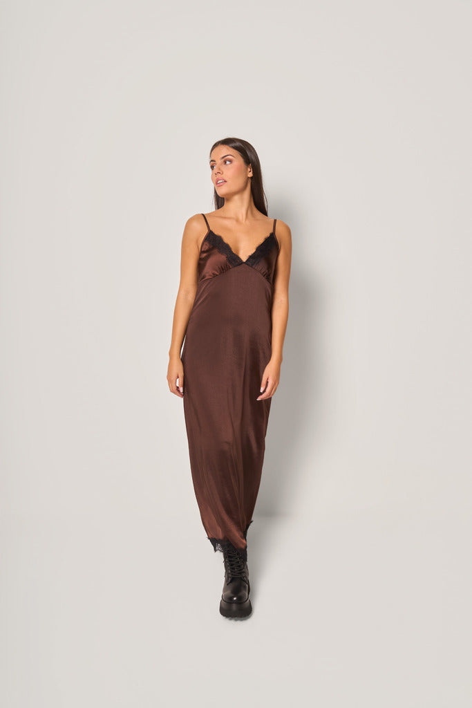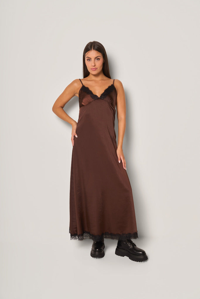 Abito lungo effetto sottoveste realizzato in morbido raso lucido. Il modello presenta spalline sottili regolabili e un elegante scollo a V impreziosito da inserti in pizzo nero, per un tocco sensuale e sofisticato.La linea dritta e fluida segue dolcemente le forme.