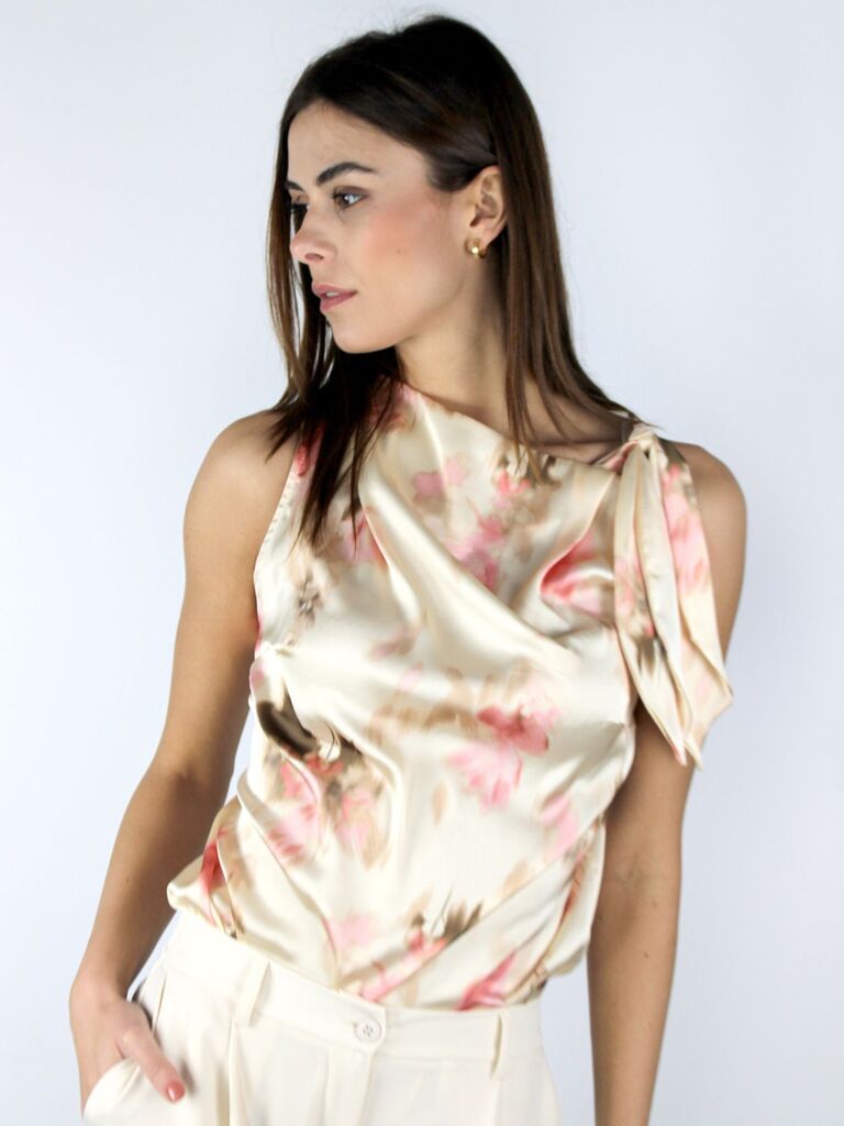 camicia smanicata con stampa floreale,con fiocco sulla spalla