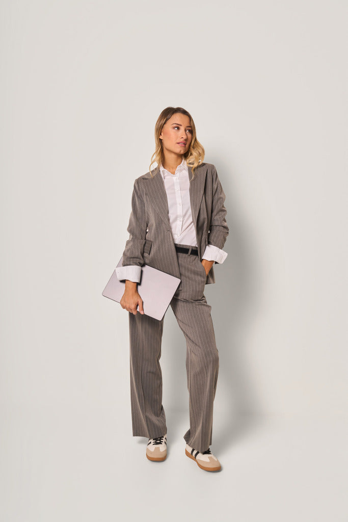 Blazer monopetto dal taglio classico con una linea leggermente over, perfetto per look eleganti e contemporanei. Realizzato con micro righe tono su tono, dona struttura e leggerezza al tempo stesso. Il design è completato da revers classici, tasche frontali con patta e chiusura a un bottone.