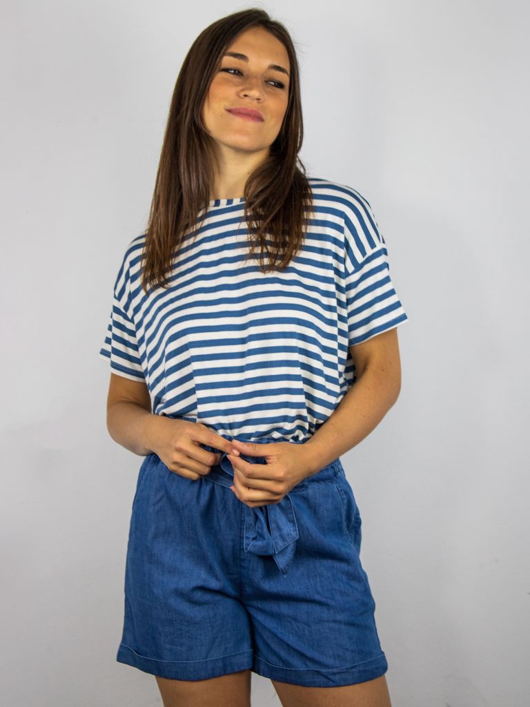 DESCRIZIONE Bermuda con vita alta elasticizzata e arricciature. Tasche anteriori. Orlo con risvolto. Dettaglio di cintura dello stesso tessuto Composizione: 65% cotone, 35% lyocell Codice prodotto: 242634