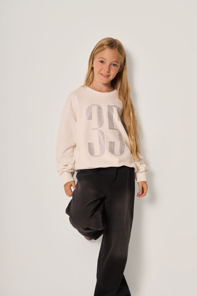 Felpa girocollo in morbido cotone color panna, dal design semplice ma luminoso grazie alla stampa frontale con numero “35” decorato da micro strass. Il modello presenta maniche lunghe con polsini elasticizzati, vestibilità comoda e tessuto felpato interno, perfetto per la stagione autunnale e invernale.