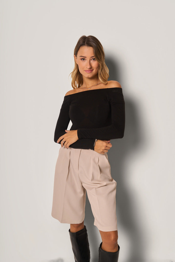 DESCRIZIONE: Bermuda eleganti realizzati in tessuto fluido con vita alta e pinces frontali che valorizzano la silhouette. Il design d’ispirazione tailoring e la lunghezza al ginocchio donano un’eleganza disinvolta e contemporanea. Codice prodotto: 260628